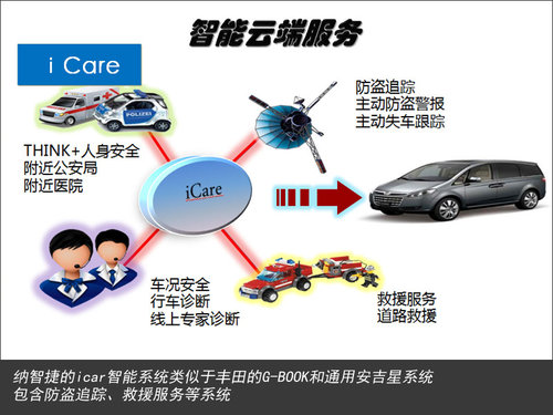 纳智捷大7 MPV “无缝智慧系统”的另一个功能就是智能云端服务系统,这与丰田的G-Book和通用的安吉星的救援系统基本一致,在出现盗抢、车祸等危险情况下,车内乘员只要一按中控台的SOS按键就可接通服务中心得到帮助。不难看出这项功能在必要时可以起到摆脱危机的作用,而日常对于车辆状况的提前预知也可以轻松完成。