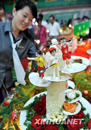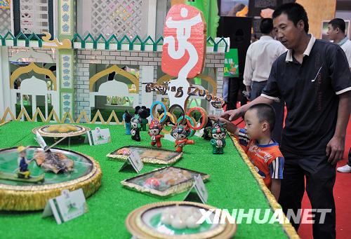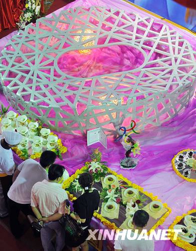 8月15日,银川清真美食节现场的“鸟巢”吸引观众驻足观看。在8月15日开幕的2008宁夏银川第二届清真美食文化节上,各色融入了奥运元素的清真美食成为人们关注的焦点。新华社记者 王鹏 摄