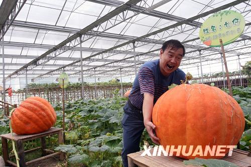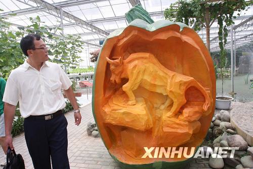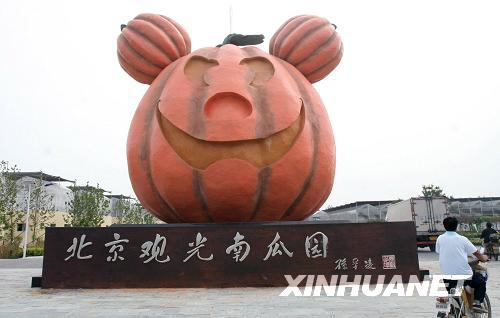 8月20日,在北京观光南瓜园,一位男士欣赏“南瓜”造型。近日,地处北京市通州区的北京观光南瓜园开园,南瓜观光园集科普、教育、示范及旅游观光为一体。新华社发(陈晓根摄)