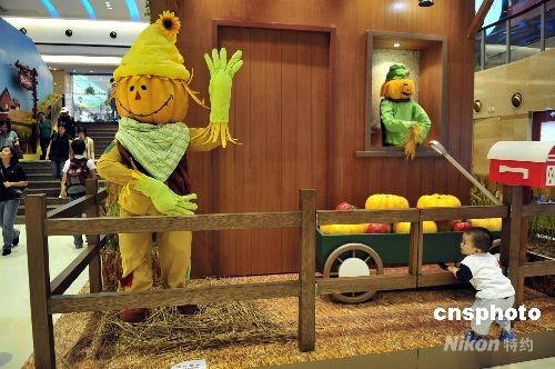 资料图:香港一商场布置不少鬼怪造型,引来市民注目或拍照。 中新社发 谭达明 摄