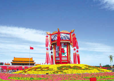 经过北京园林工人近一周的紧张工作,9月25日,天安门广场迎国庆景观花坛整体亮相。中央花坛的巨型宫灯及东北侧的福娃、福牛花坛成为最大的亮点,引得游客纷纷在此驻足拍照留影。