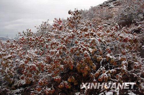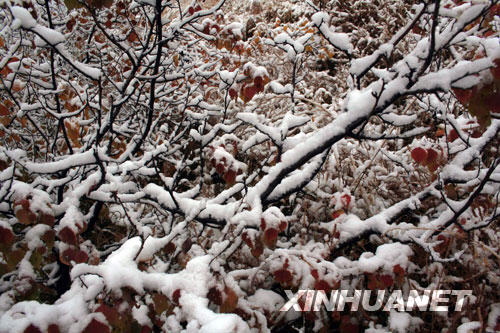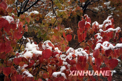 10月5日,在内蒙古克什克腾旗,秋雪挂满枝头树叶。新华社发(孙国树摄)