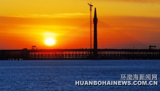 曹妃甸工业区1号桥工程经过2年多的建设现已接近尾声,预计明年4月中旬完工投入使用。届时,由唐曹高速经1号桥可直达曹妃甸港区码头。大桥位于曹妃甸工业区3号路上,跨越千米宽的纳潮河,桥梁全长2.02公里。主桥采用独塔单索面钢箱叠合梁斜拉桥,跨径为276米。双向六车道设计,桥面总宽度40米。工程施工方为中交集团第一公路工程局。图为大桥在夕阳的照耀下更加雄伟壮观。本报记者董军摄