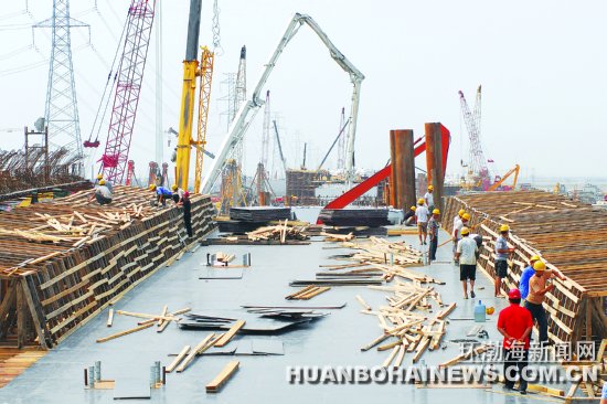 跨纳潮河大桥位于曹妃甸港区连接工业区与陆域的一号公路上,主体工程全长1700米,桥面总宽38.5米。目前,工程已进入桥身水泥浇注阶段,大桥采用先堵后疏的方式,在保证工程质量的同时全面提升建桥速度。大桥建成后,即可打通桥下水路,恢复海岸原有的海洋生态和动力平衡牞成为曹妃甸的一大美景。据悉,大桥将于今年底建成通车。本报记者董军摄