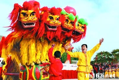 庙会上的舞狮表演。