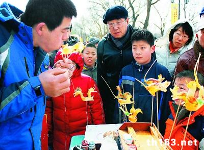 游客观看“吹糖人”表演。
