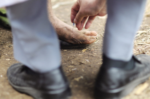 长年的山上生活让老三患上了脚病,医生正在为他诊断病情