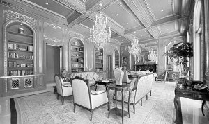 据了解,这套法式豪宅共有9间卧室、13个卫生间。入口大厅为两层,两侧均配有大理石楼梯。图书室的墙壁和天花板都有镀金装饰。尤其值得一提的是,该建筑的室内装饰使用了大量进口的手工雕刻的石灰岩、法式枝形吊灯、玛瑙石材以及24K纯金饰品,美轮美奂犹如豪华宫殿,令人叹为观止。