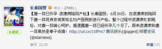 腾讯娱乐讯6月7日,凌潇肃和唐一菲在武汉举行了低调的教堂婚礼,凌潇肃在随后公开亮相的活动中也承认了唐一菲这个新老婆。昨晚,知名爆料博主“长春国贸”在博客透露,6月30日,在凌潇肃的陪同下,唐一菲现身京城某知名妇产医院的进行产检。在整个过程中,凌潇肃忙前跑后,对唐一菲细心呵护,照顾得非常周到。据悉,唐一菲已经怀孕几个月了。网友称:“原来凌潇肃和唐一菲的确是奉子成婚!”
