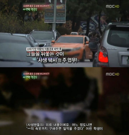 最近,甚至还出现了跟踪明星的狗仔出租车。有一个接受该节目采访的私生饭爆出,狗仔出租车司机会靠近粉丝说:“某一处有个明星,你想不想去见他。走一趟收费10万至20万韩元。”
