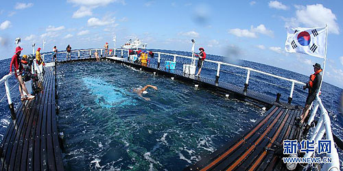 韩国歌手率队游向独岛 预计15日下午抵达登陆
