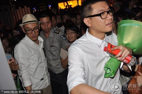 当日,胡歌的车子迟迟没有来,而其准备一路走到马路上等车,但是身后跟随了大批的粉丝,把他团团围住。无奈,其只能在临时安保人员的护送下,在活动场馆外的门卫室躲避等待。