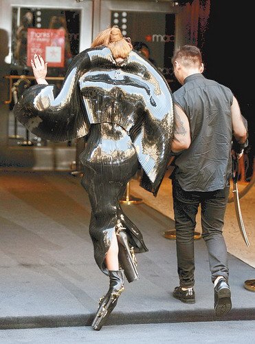 GaGa除了头上戴上设计浮夸的金色眼罩外,还穿上一身乳胶制的黑色长裙配衬犹如甲虫的外壳,造型被嘲十足驼背一样。未知是否鞋跟太高的关系,GaGa上楼梯时差点摔倒,幸有型男紧扶才没有事。