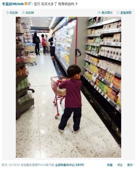 9月25日下午,李嘉欣微博上传一张小JM手推车逛超市的背影照,侧脸显露出认真思考挑选商品的神情,李嘉欣则笑问:“宝贝,你买太多了,有带钱包吗?”网友纷纷留言:“小正太都会打酱油了”,赞其帅气可爱。