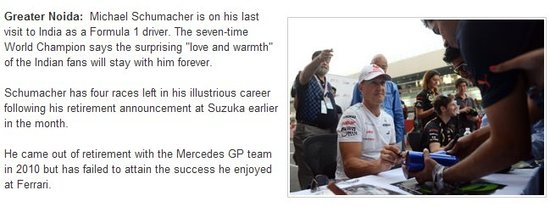 今年已经43岁高龄的舒马赫正在进行他最后一次以F1车手身份开始的印度之旅。七冠王说他很惊讶于印度车迷对他的“喜爱和热情”,这些会永远伴随着他,尽管自己在复出的将近三年的时间中仅有一个领奖台成绩,但是舒马赫并不埋怨车队,他承认是自己的失误才导致本赛季的成绩如此糟糕。