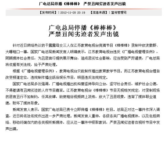 11月28日晚20时19分,广电总局宣布停播江苏教育电视台竞猜节目《棒棒棒》。