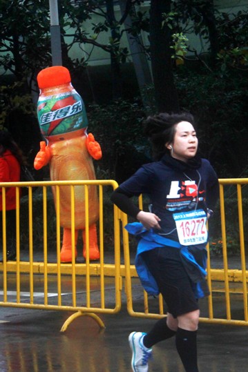 除了提供补给外,组委会还在比赛起点、终点设置了佳得乐充气人偶,不时的与观众和参赛者互动、留影;同时赛事工作人员还为最先到达终点的前十位半程和全程马拉松选手送上了保温毯和佳得乐饮料,以保证运动员的能量补充。