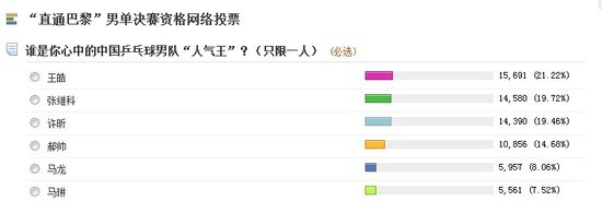 为了进一步号召网友,包括国乒将帅和热爱乒乓球的文娱明星从几天前就开始在微博预热拉票。这一举动果然收效良好,短短一天时间就有73000多网友参与投票。截止到9日早晨8点,排名前三位的选手分别是王皓、张继科和许昕,得票率分别为21.19%、19.73%和19.49%。