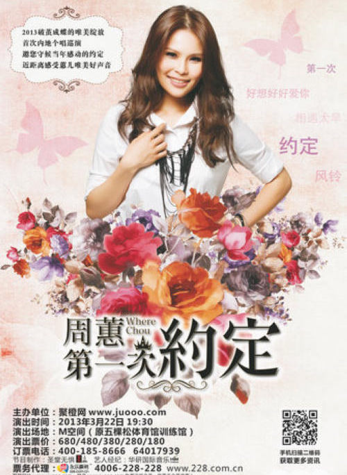当年天后王菲都无法唱红的粤语版《约定》,其国语版一经初出茅庐的周蕙演绎,迅速红遍大江南北,独占音乐排行榜首位长达半年,使她与同期新人蔡依林、萧亚轩、孙燕姿并称“台湾四小天后”,也让歌迷们真正认识了她。出道15年,她的诸多经典情歌在大陆火热传唱,家喻户晓,她的歌也因为优美的歌词和动人的旋律,一直成为广大歌迷的心灵“伴侣”。《不想让你知道》、《咖啡季节》、《守约》等曲目都成为了广泛传唱、家喻户晓的情歌经典。相信届时演唱会现场,丝丝入扣的旋律、耳熟能详的歌曲、柔情百转的演绎将让现场成为千人感动的温馨大舞台。