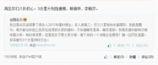 近日,网上出现一超级人气贴,帖子标题为“唐嫣被甩,邱泽发微薄侧面证实已经和唐嫣分手,疑似劈腿李毓芬”在将近37万的点击中,网友找到了大量疑似邱泽同时交往三个女星的证据,除了唐嫣和李毓芬,竟然还有和邱泽共同出演《螺丝小姐要出嫁》的赖雅妍。这简直让人大跌眼镜。