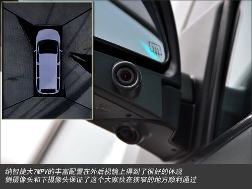 除车头车尾外,纳智捷大7 MPV在外后视镜还设计有两个摄像头,这些配置可以帮助这款车在狭小道路等区域顺利通过,摄像头重叠部分影像的处理非常出色,提供了视野盲区的影像减小了危险发生的几率。值得一提的是具有360度影像合成技术的品牌寥寥无几,更多的只是倒车雷达和尾部加装摄像头而已,纳智捷是少有的几个拥有这一项技术的品牌。在轮胎方面,这款车采用了215/55 R17型号的轮胎,主要考虑的重点还是兼顾舒适性和经济性。