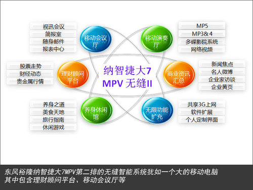 纳智捷大7 MPV的“无缝智慧系统”是一部车载Android系统的计算机服务器,内置双SIM卡以及多款定制软件,将拥有移动上网、移动办公、Office文件浏览等全方位的商务功能,这些功能对于商务人士来说非常重要。从功能性而言,纳智捷大7 MPV将提供与办公室无异的商务环境,内置的3G网卡可以随时连接WIFI网络,系统还附带了无线键盘,在行驶途中,我们非常顺畅的完成了网页浏览、视频播放等多种功能,并且兼顾了商务需求,日常不够用的时间完全可以在车内被节省出来。。
