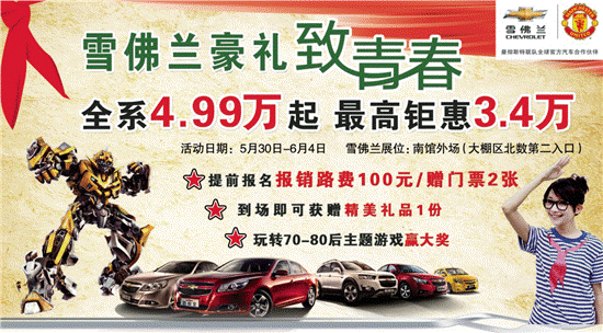 最低的价格【2013年国际车展】雪佛兰“豪礼致青春”!雪佛兰全系4.99万起,最高钜惠3.4万!绝对推出全年最底价,当天订车客户还可参加70-80后主题游戏赢取阶梯大奖!