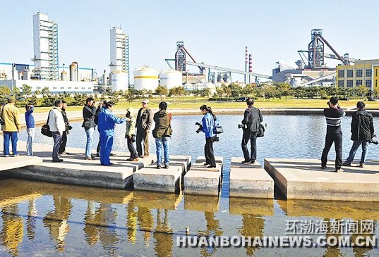 图为摄影记者们在首钢京唐钢铁公司采访拍摄。