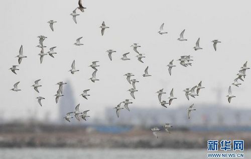 黑腹滨鹬和环颈鸻结群在曹妃甸湿地低空飞行(3月12日摄)。近日,包括鸻鹬、黑尾塍鹬、反嘴鹬、黑腹滨鹬、环颈鸻、蛎鹬等在内的20余种候鸟成群飞抵河北省唐山市曹妃甸湿地,为进入三月天气转暖以来曹妃甸湿地春季候鸟迁徙的最高潮。