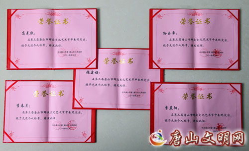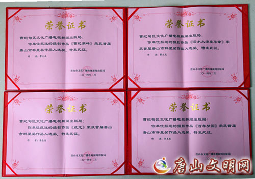 舞蹈作品《鱼娃乐》、《老来俏》,音乐作品《百姓的幸福是你最大的愿望》,摄影作品《逐浪》在众多入选作品中脱颖而出,荣获唐山市首届“群星奖”优秀作品奖。