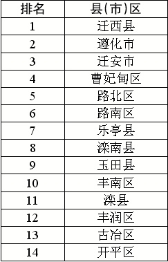 9月11日,市环保局公布了全市各县(市)区9月1日至10日空气质量排名。按照城市环境质量综合指数评价,全市14个县(市)区由好到差排名情况依次是:曹妃甸、迁西、滦南、乐亭、遵化、迁安、路北、路南、玉田、滦县、丰南、丰润、开平、古冶。