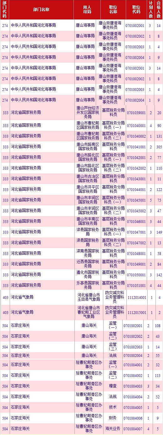 截至21日16时,竞争最激烈的三个职位依次是:唐山市路南区国家税务局科员、唐山市曹妃甸区国家税务局科员(二)和石家庄海关驻曹妃甸港区办事处监管(二),三职位通过审核总人数达549人,占通过审核总人数的26.5%。