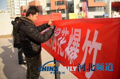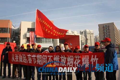 春节将至,曹妃甸工业区环保分局、再生资源园区党员志愿者们在蓝海佳苑社区门口向市民讲解燃放烟花爆竹的危害。并在街道、社区、广场悬挂张贴禁止燃放烟花爆竹标语,开展百人签名活动,倡导群众保护环境,提醒群众春节期间不要燃放烟花爆竹。