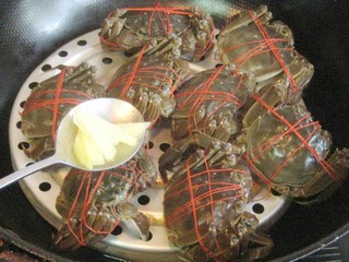 3.锅里加适量清水,加些料酒,把螃蟹放到蒸屉上,撒上一些姜丝。