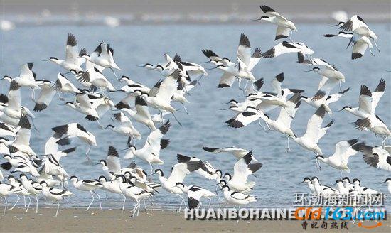 图为一群刚刚到达的反嘴鹬迎风起舞。本报记者 闫军 摄