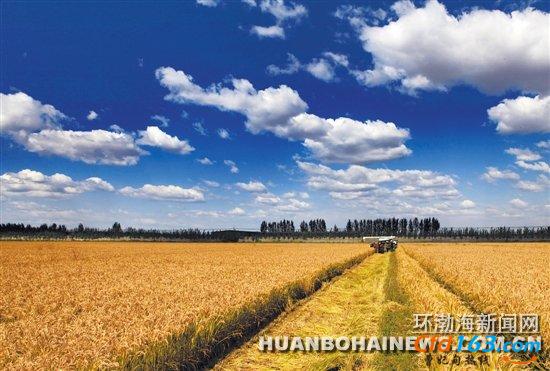 环渤海新闻网消息 近日天气晴好,是稻谷收割的最佳时期。记者在曹妃甸区八农场见到各式水稻收割机开进稻田。蓝天白云下,成群的鸟儿在金黄色的稻田里上下翻飞,伴随着收割机的轰鸣声,好一片繁忙的秋收景象。今年风调雨顺,据估算,大多品种亩产可达600公斤左右。