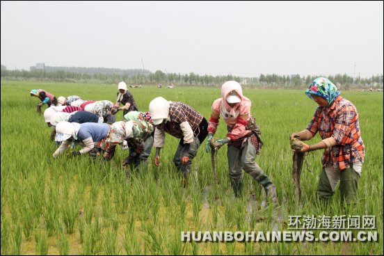 环渤海新闻网消息 (纪哲)碧绿的水稻田间,一排农妇脚踩雨靴、头戴遮阳帽,弯腰边挑出秧苗中的杂草并拔除,边用手指在水底挠秧松土,再捞起水面漂浮的水绵......一连串的动作麻利又熟练。近日,记者在唐山市曹妃甸区见到了这种目前罕见的传统原生态水稻种植方式。