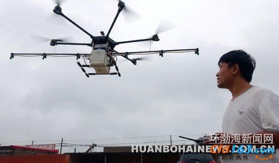 在曹妃甸区八农场,一架盘旋在农田上空的无人机正在给农作物喷洒农药。当地优秀青年企业家孙杰在一旁手持遥控器,操纵着他自主研发的杰作。这是喷药无人机首次在曹妃甸投入使用。