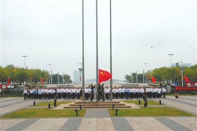 上午9时,升国旗仪式开始,由区边防检查站士兵组成的国旗护卫队,迈着铿锵有力的步伐走向升旗台。随着“升国旗、奏国歌”的口令,庄严的《义勇军进行曲》响起,掌旗手振臂一挥,五星红旗被抛出一个优美的扇形,在雄壮的国歌中冉冉升起。大家面向国旗肃穆而立,目送五星红旗冉冉升起,共同祝愿祖国更加繁荣昌盛。