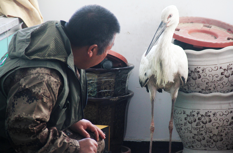 当志愿者来到唐山曹妃甸省级湿地和鸟类自然保护区管理处时,动物救助人员正对一只受伤的东方白鹳进行查体并展开救助。当日,中国野生动物保护协会“护鸟飞”野外巡护宣传活动南线志愿者团队受邀前往湿地管理处巡护站,与巡护站工作人员交流、分享巡护技术和保护候鸟经验。